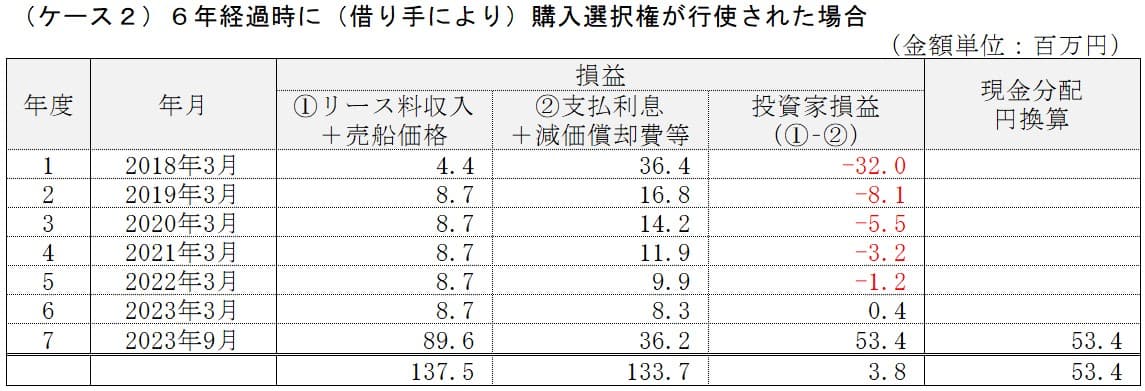 ・借り手が購入選択権を行使するタイミングにより、JOLの終了時期が3つのケースに分かれます。いずれの場合も、投資家への利益計上額と現金分配額の大部分は最終年度に行なわれます。