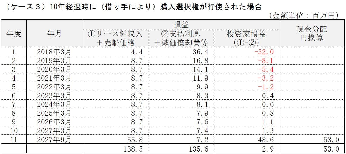 この例は、文末「投資採算予想表」のケース3(10年経過時に(借り手により)購入選択権が行使された場合)を前提としており、金額単位はいずれも百万円です。